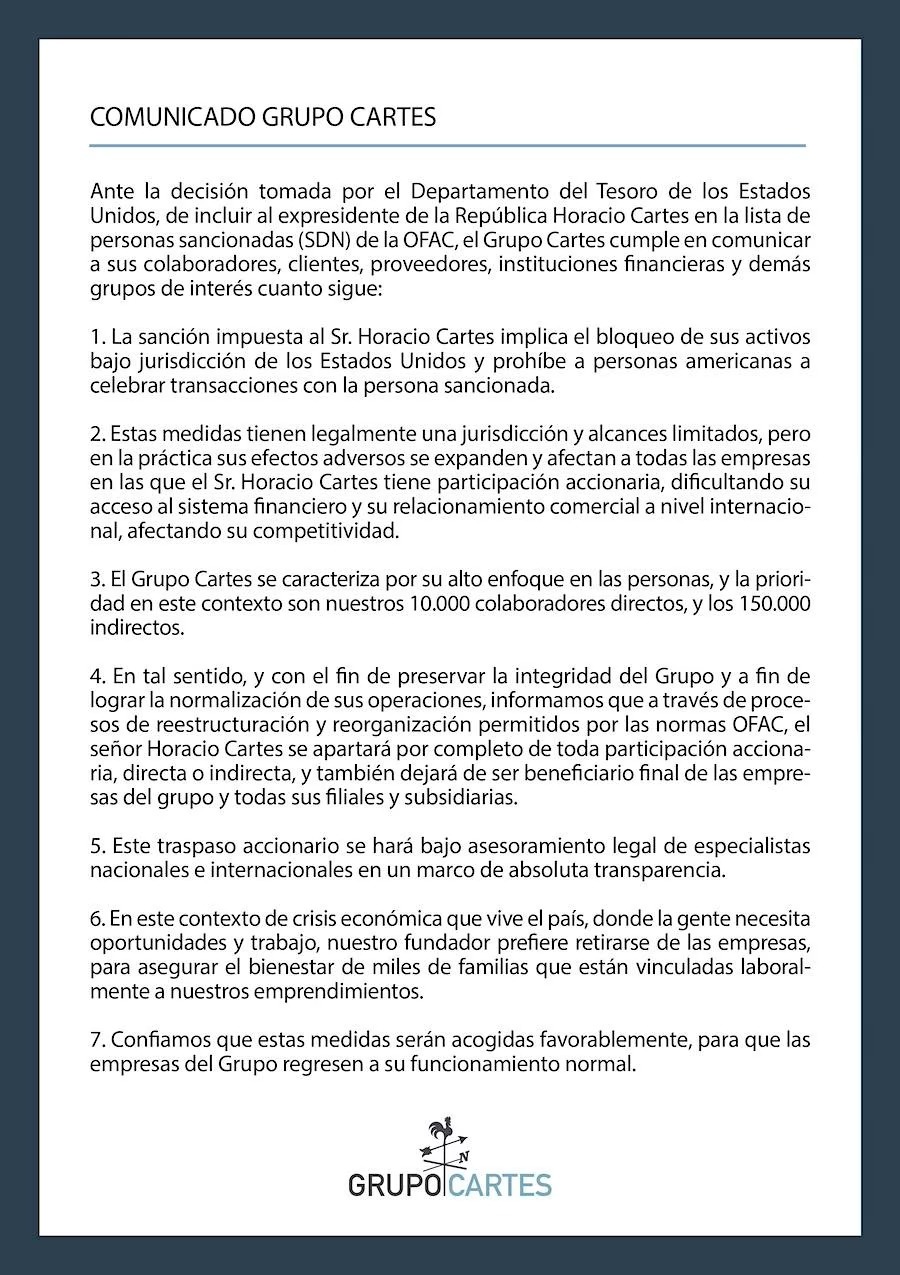 Reconociendo que las medidas anunciadas, pese a que “tienen jurisdicción y alcances limitados”, están generando “efectos adversos” en todas las empresas del Grupo Cartes, el exmandatario tomó la decisión de deshacerse de todas las acciones que tiene a su nombre.