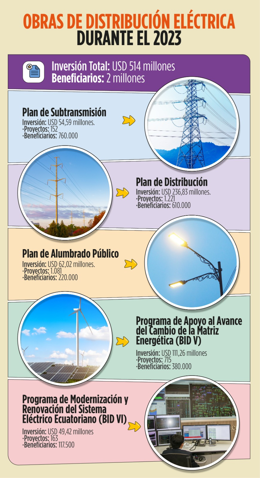 El Ministerio de Energía y Minas de Ecuador anunció que a través de sus 10 empresas distribuidoras a nivel nacional, invertirá US$ 514 millones en obras eléctricas para el año 2023, beneficiando de esta manera a 2 millones de ecuatorianos, a través de planes y programas enfocados al mejoramiento de la calidad de servicio, expansión del sistema eléctrico y la modernización de infraestructura que contribuyen con la confiabilidad, continuidad e incremento de la capacidad instalada del sistema eléctrico del país.