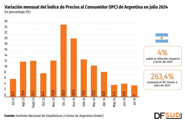 El Índice de Precios al Consumidor (IPC) de Argentina subió 4% en julio con lo que suma un aumento de 263,4% en los últimos 12 meses y de 87% en lo que va de 2024.