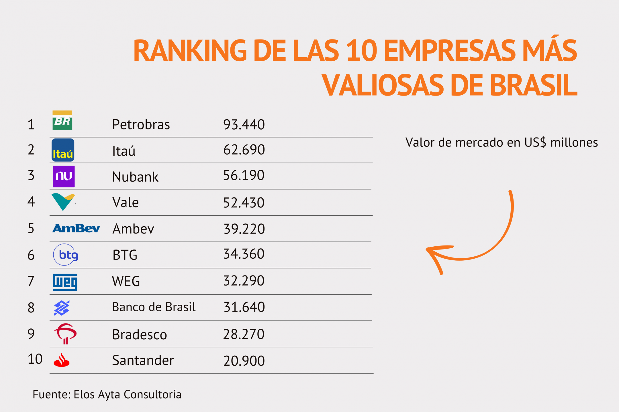 Según un estudio de Einar Rivero, de Elos Ayta Consultoria, Petrobras alcanzó un valor de mercado de US$ 93.440 millones, seguida por Itaú (US$ 62.690 millones), Nubank, Vale (US$ 52.430 millones) y Ambev (39.220 millones).