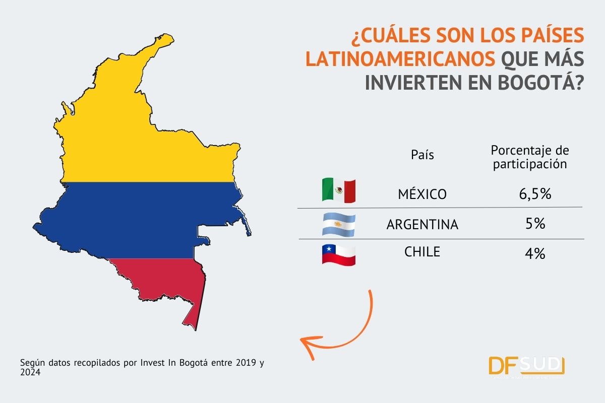 Pese a que Estados Unidos está primero en el ranking de los países que más invierten en la capital con una participación del 24,4%, México y Argentina se coronaron como los líderes latinoamericanos en dicha lista. Mientras que México ocupa el primer lugar en la región con una participación de 6,5% en los proyectos ingresados a la capital del país cafetero, Argentina alcanzó una implicación del 5% en 2024.