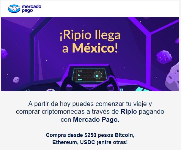 "A partir de hoy puedes comenzar tu viaje y comprar criptomonedas a través de Ripio pagando con Mercado Pago. Compra desde $ 250 pesos (mexicanos; unos US$ 12) Bitcoin, Ethereum, USDC ¡entre otras!", escribió la compañía argentina en un correo electrónico enviado a sus usuarios en la nación norteamericana.
