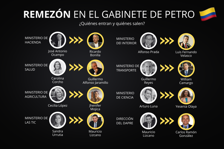 En el Ministerio de Agricultura fue nombrada Jhenifer Mojica quien sustituirá a Cecilia López, mientras que otro que salió del gabinete fue Arturo Luna, ministro de Ciencia; Yesenia Olay entró al cargo. Al Departamento Administrativo de la Presidencia de la República (Dapre) llegó Carlos Ramón González, en sustitución de Mauricio Lizcano quien entró al Ministerio de Tecnologías de la Información y Comunicaciones (TIC). Este último militó en el Partido de la U hasta el año 2021 y se dice cercano al mandatario.