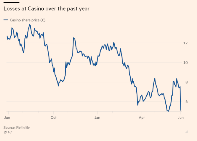 Las acciones de Casino, que se recuperaron ligeramente para cotizar un 32% más bajas al mediodía, se han reducido casi a la mitad desde principios de año, según muestran los datos de Refinitiv. La empresa, que es el sexto mayor grupo alimentario de Francia por cuota de mercado, lleva meses en conversaciones con los acreedores para reestructurar su deuda multimillonaria.